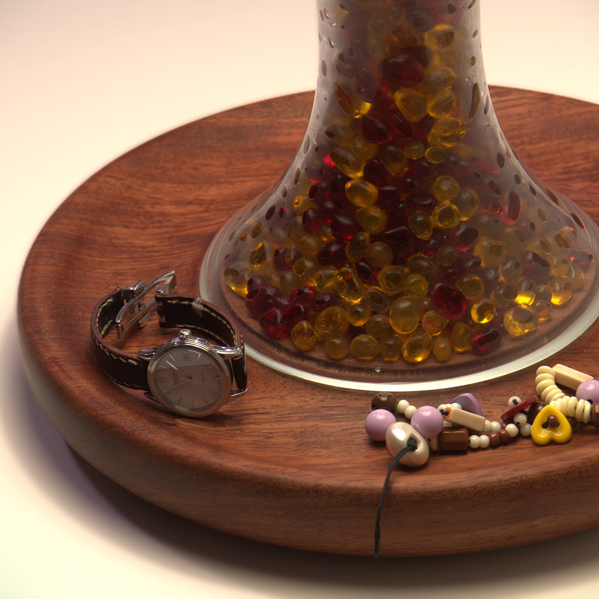 A shallow inset tray in the base offers a practical place for rings, watches, or small everyday items.