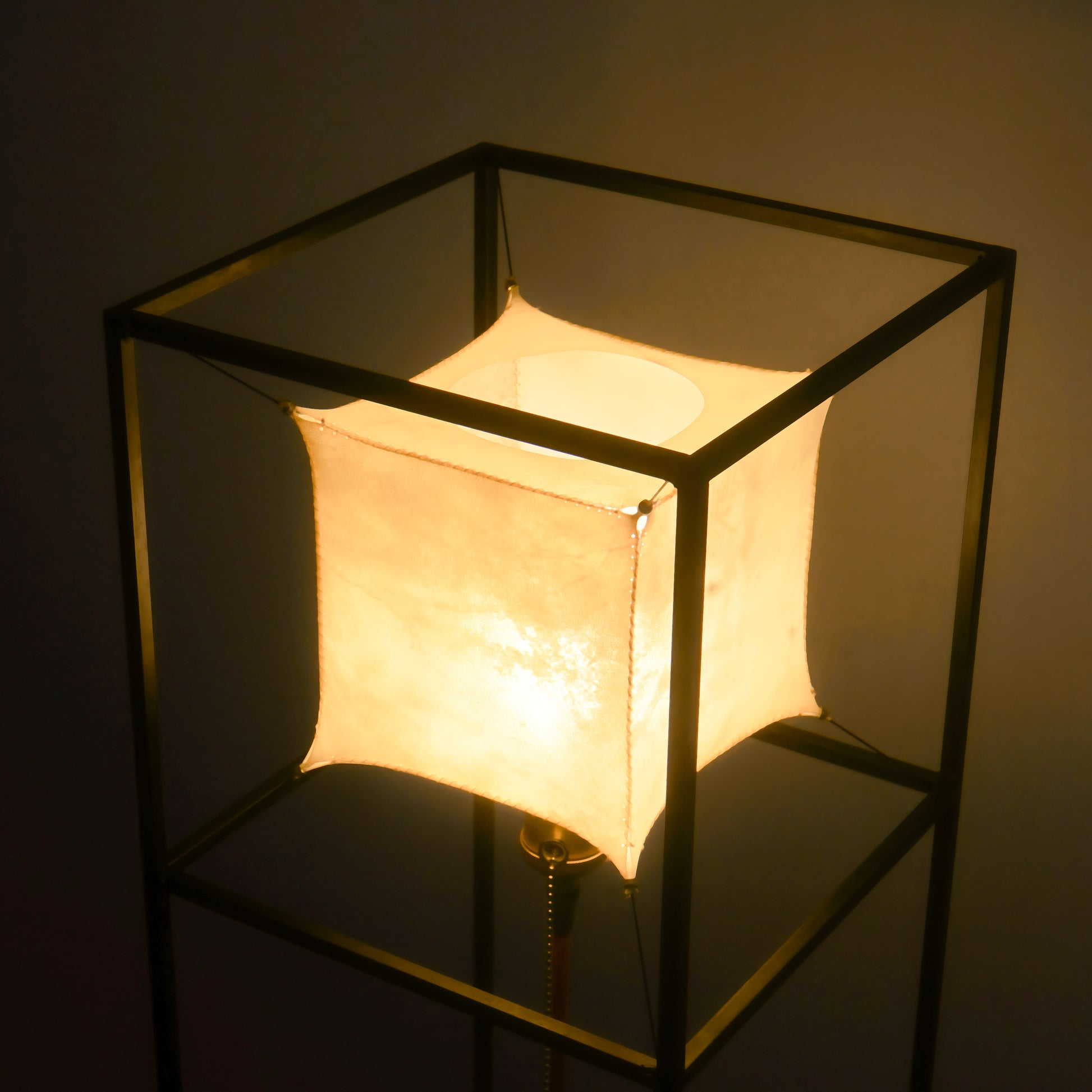 Unlike mass-produced floor lamps, every component of this piece is handmade — from the stitching of the rawhide to the heat-blackening of the steel and the finishing of the walnut base.