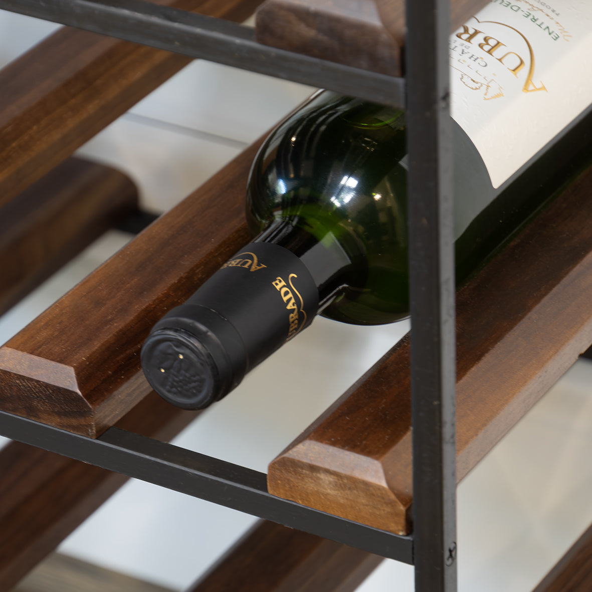 Angled wine racks securely hold bottles in a consistent, practical layout